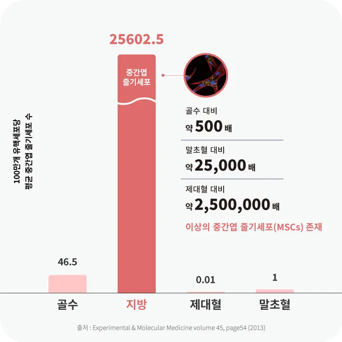 특히 지방에는 골수, 제대혈, 혈액보다 최소 500배에서 최대 2,500,000배 이상의 중간엽 줄기세포가 존재하는 것으로 확인된 바 있어 모닛셀의 고품질 지방 유래 중간엽 줄기세포 추출 기술의 활용이 기대되고 있습니다.