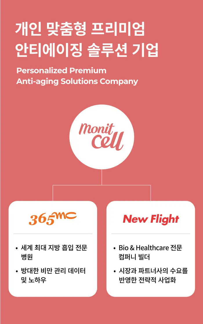 모닛셀은 세계 최대 지방 흡입 병원 365mc와 바이오 전문 컴퍼니 빌더 뉴플라이트의 합작 회사로, 365mc로부터 지방을 독점 공급받아 인체 지방 유래 ECM 및 줄기세포의 뛰어난 재생과 회복 능력을 이용한 안티에이징 및 재생 의료 솔루션을 개발합니다.