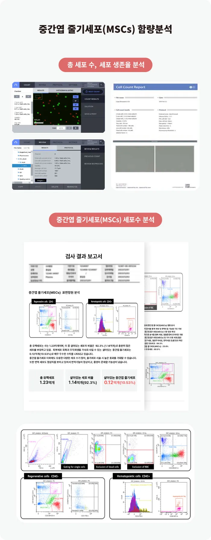 또한, 모닛셀은 첨단 분석기기(FACS)를 사용하여 SVF 내에 존재하는 지방 유래 중간엽 줄기세포(MSCs) 및 기타 유효 세포(혈관 내피 전구세포, 혈관주위세포, 면역세포 등)에 대한 분석 정보를 제공합니다.